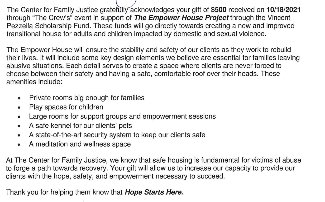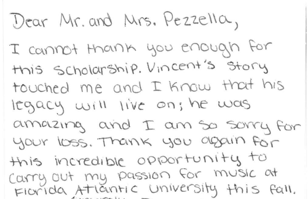 Vinny’s fascination with music began at the age of 8 when he joined a local childrens’ band camp, where he quickly fell in love with the drums. Suitably, helping young musicians seemed like the perfect purpose for this organization. In the wake of his passing, the Pezzella Family established a scholarship for Trumbull High School students planning to pursue a career in the performing arts.