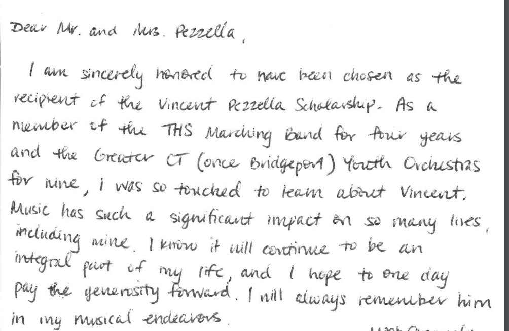 Since then, the scholarship has grown significantly and now helps aspiring musicians and artists across Fairfield County pursue their dreams. From sponsoring students in local ensembles to purchasing instruments for underprivileged districts, the Vincent Pezzella Scholarship is committed to honoring Vinny’s memory by consistently providing new, meaningful opportunities for youth education in the arts.